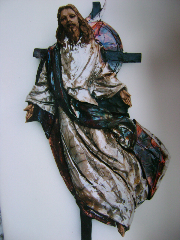 Risen Christ; 24" in height x 14" in width; Sacred Heart Catholic Church, Grosse Ile, MI; fired clay with raku glaze